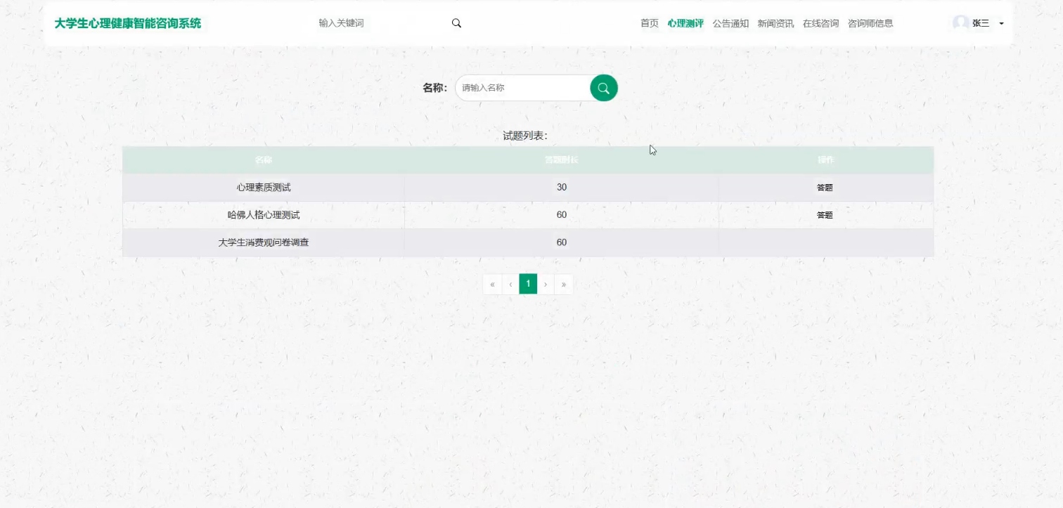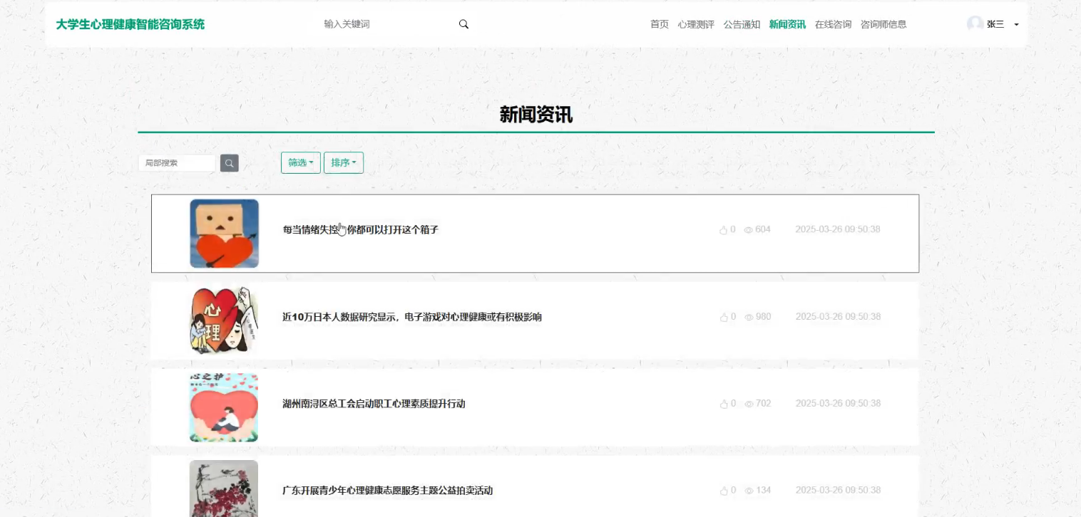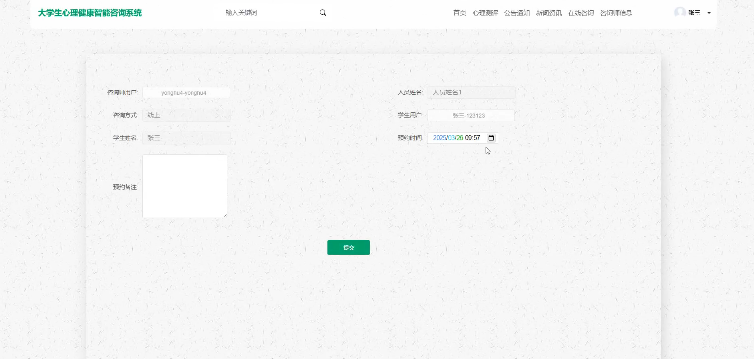 This system is designed and developed based on the SpringBoot framework, and builds an intelligent consultation service platform according to the mental health needs of college students. The system adopts B / S architecture, combines JAVA language and MyBatis-Plus data persistence layer technology to realize multi-role collaborative management mode, including three functional modules: student user, consultant user and administrator. Student side provide psychological assessment, AI intelligent quiz, online consulting, consultant appointment, news and information interaction, such as core functions, support thumb up collection, comment interaction, consultant side integrated review, assessment appointment bank management, online consulting reply and other professional services, management through the authority control, complete the user management, resource maintenance, announcement, system level operation, build a complete mental health service ecosystem.