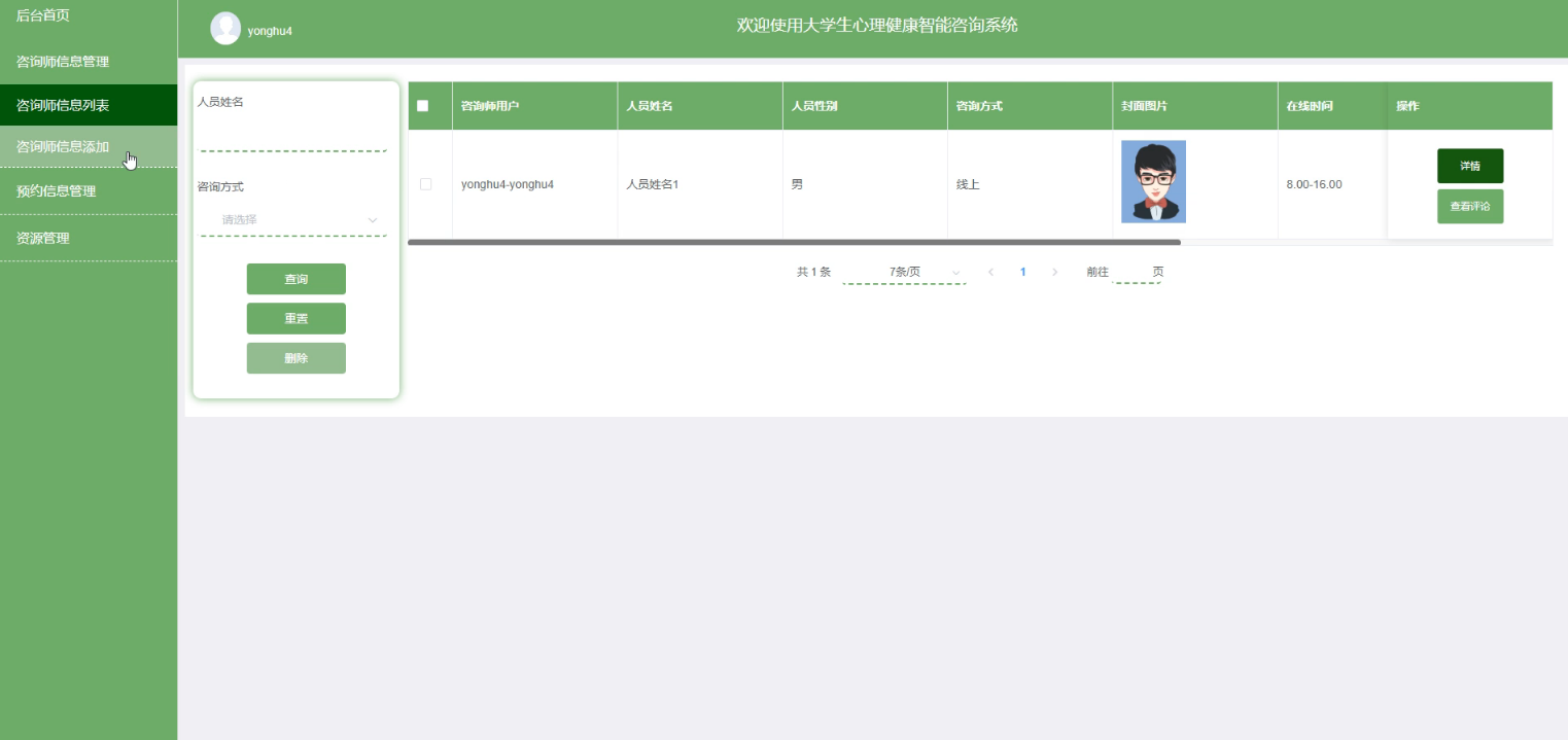 - 咨询师信息管理:此模块允许咨询师用户进行咨询师信息的添加、删除和查询操作。咨询师用户可以查看详细资料。还可以查看用户对咨询师的评论,以评估服务质量。