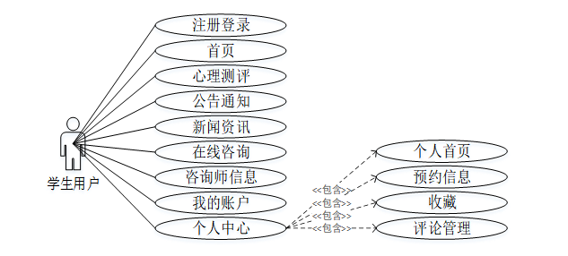 大学生心理健康智能咨询系统的完整UML用例图分别是图3-1、3-2、3-3。