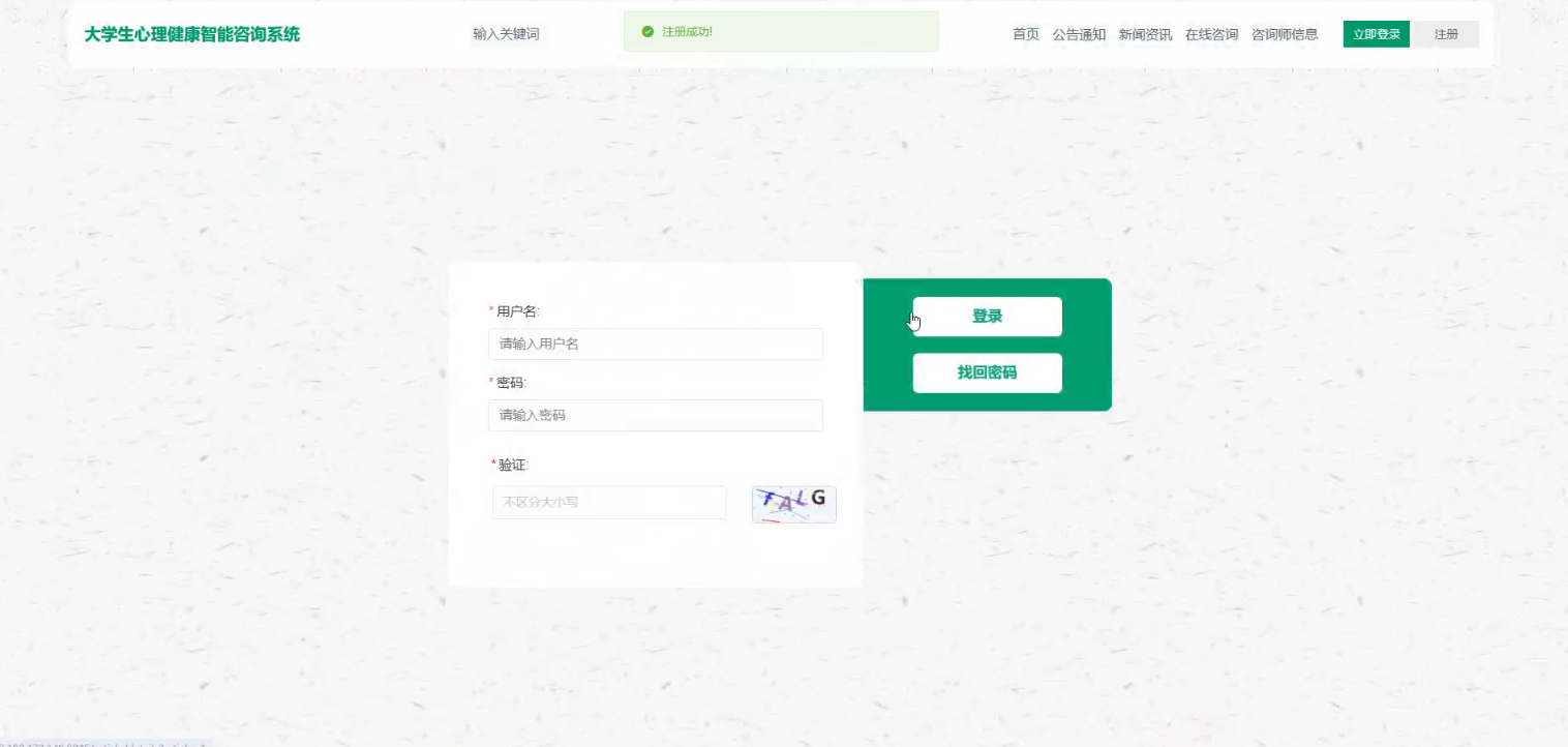 - 登录:咨询师用户由管理员添加,并且咨询师可以通过前台登录系统,以便进行在线咨询的回复。系统提供安全的认证机制,确保只有授权的咨询师可以访问其账户。