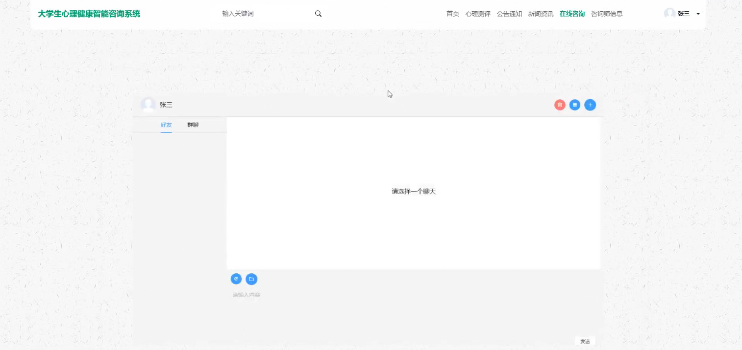 - 在线咨询:学生可搜索并添加认证咨询师进行一对一私聊,或根据需求创建群组讨论特定话题。聊天界面支持文字、语音及文件传输,咨询记录可加密保存。