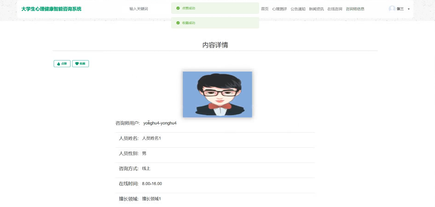 - 咨询师信息:展示咨询师的资质、擅长领域及用户评价,学生可查看详情并预约咨询服务。支持点赞、收藏或发表评论,收藏的咨询师信息可在个人中心统一管理。