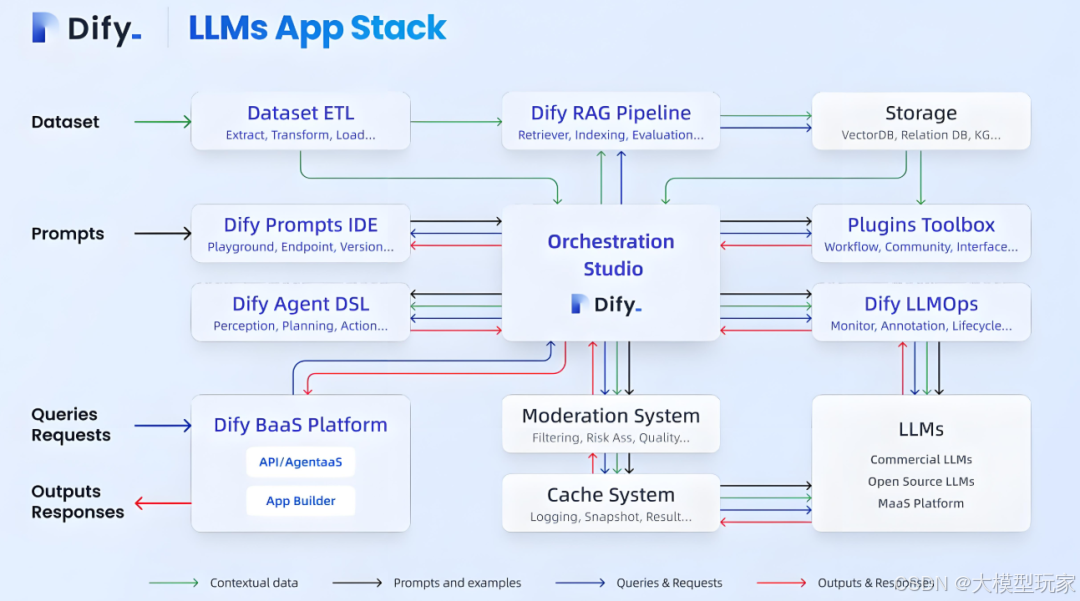 Dify 是2023年开源的明星项目,目标是打造一个“AI时代的后端即服务(BaaS)”。它把 RAG、工作流、模型管理、API发布、监控日志等功能都集成在一个平台里,堪称“智能体开发的瑞士军刀”。
