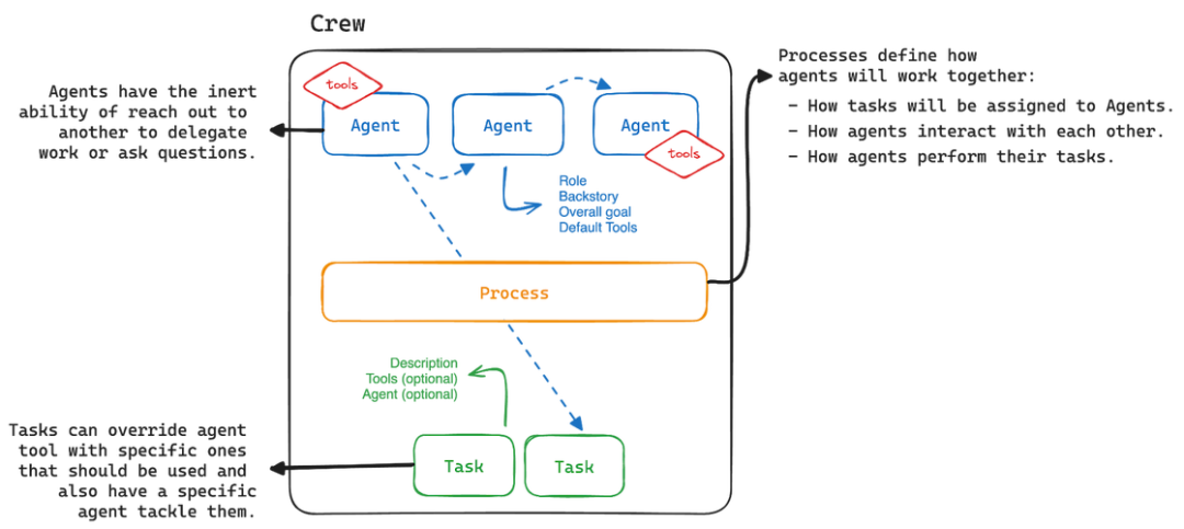 CrewAI 的理念与 AutoGen 类似,但更强调角色分工与任务管理。你可以定义: