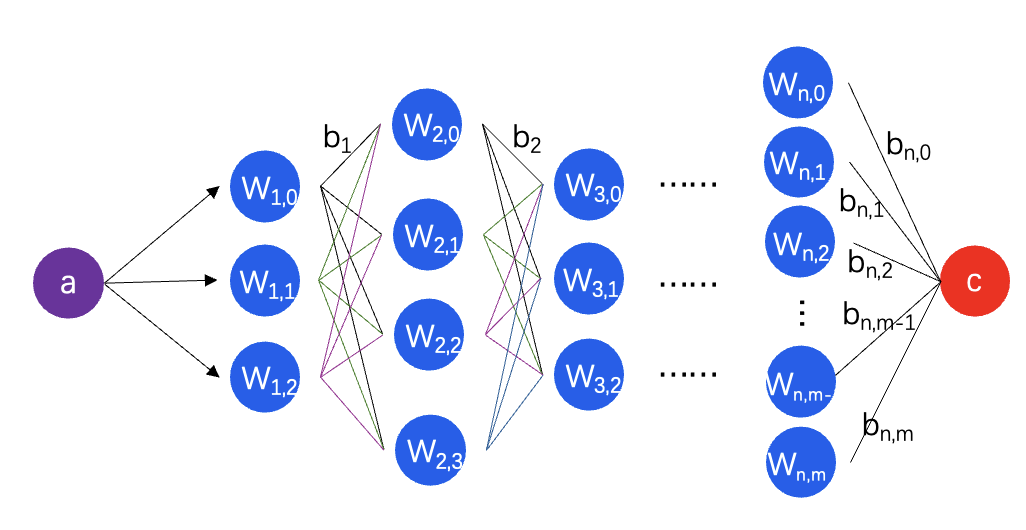 ③ 全连接:full connected network,在图2中,第0层的神经元与第1层的每个神经元都相连,这里神经元是指权重,连接线是指偏移量,每个计算结果(a*w+b)又会被送入所有的下一层神经元产生计算结果。