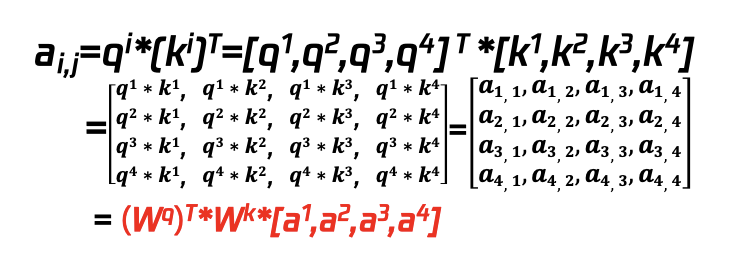 如图42所示,为Self-attention的过程,可以针对Q、K、V进行拆解: