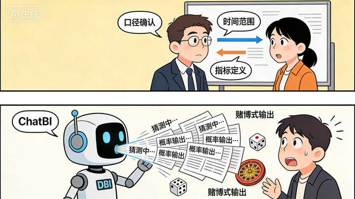 ChatBI的厂商们描绘了一幅动人图景:只需用日常语言提问,AI便能心领神会。但这却常常演变成一场典型的“鸡同鸭讲”——业务人员说着真实的业务诉求,AI却基于数据关联给出自说自话的答案。双方看似在对话,实则从未在同一频道上真正理解过对方。