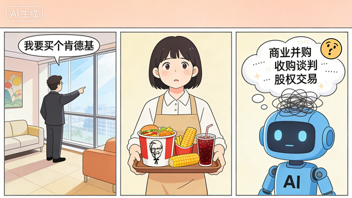 AI模型却往往基于训练数据中的片面关联,武断地解析为"商业并购肯德基",并给出荒谬的分析。