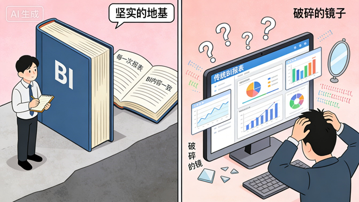 传统BI报表的基石在于"确定性"和"可复现性"。上月查看的报表,本月打开依然一致,这为决策提供了可信赖的基础。