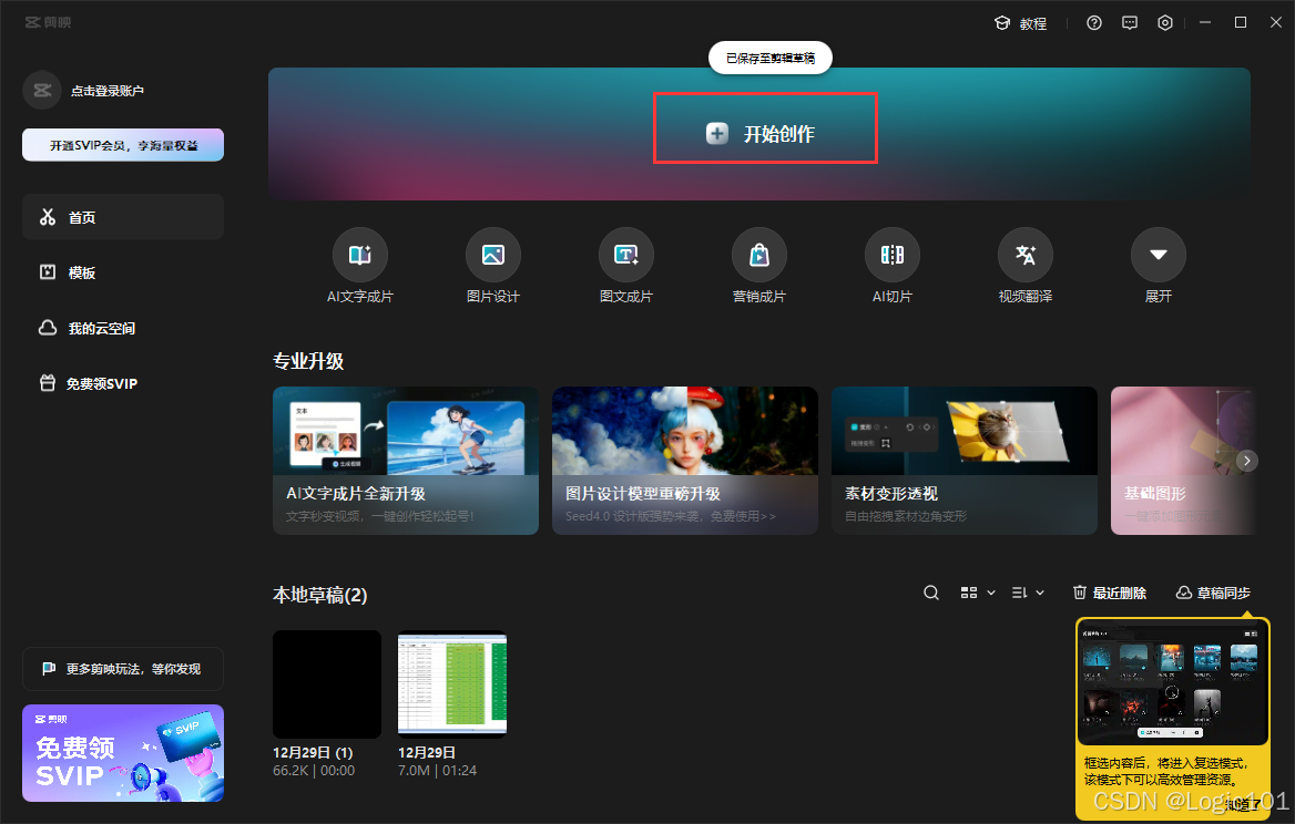 打开剪映专业版,点击“开始创作”