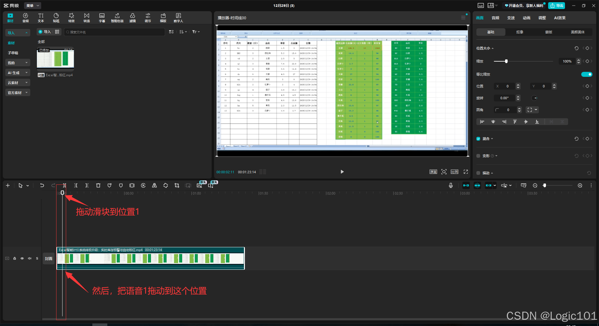 位置3(pos3):"在Sheet1的B列、C列分别输入代号、数量,M列就会实时统计剩余库存。当库存量小于10时,会自动标红预警,提示用户及时补货"(语音3)