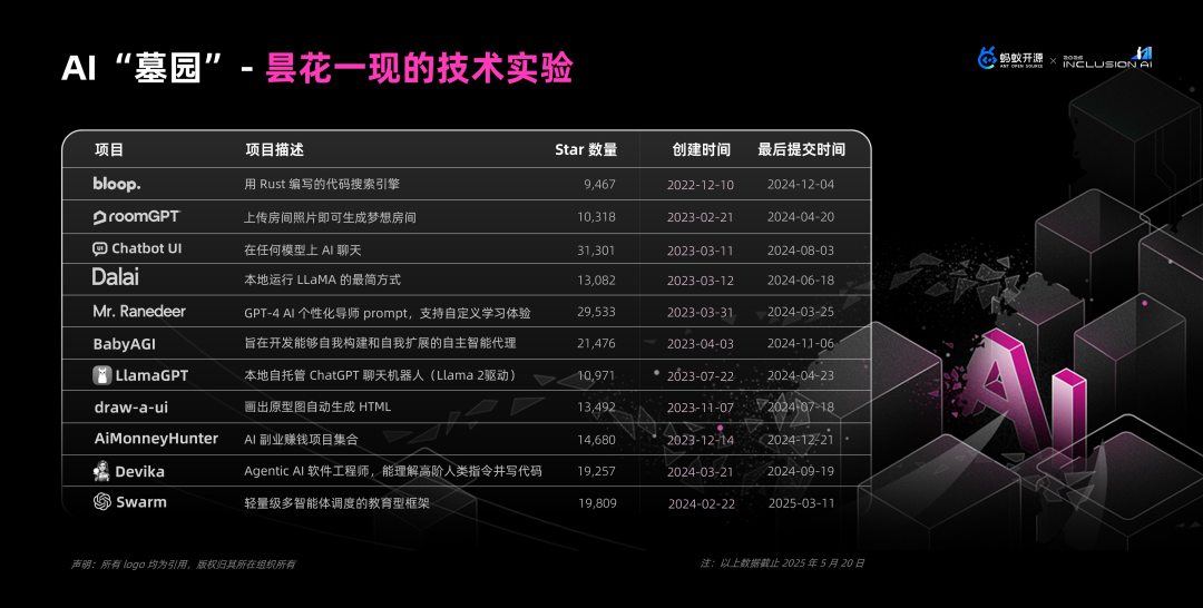 比如曾获得过 3.1w 个 Star 的 AI 聊天应用 Chatbot UI,从 2023 年 3 月创建,到 2024 年 8 月消亡,也不过一年半的光景。还有曾获得过 2.1w 个 Star、堪称是最早对 AGI 进行想象的项目之一的 BabyAGI,即便早在 2023 年 4 月就前瞻性提出了“自我进化 Agent”的设想,最终还是在一年半后消失在茫茫数字世界中。甚至连 OpenAI,也有项目出现在这份“死亡名单”中——提出了“群体智能”的概念 Swarm,曾在发布时获得了极高的关注度,但最终被产业可落地的 OpenAI Agents SDK 所替代,逐渐淡出公众视野。