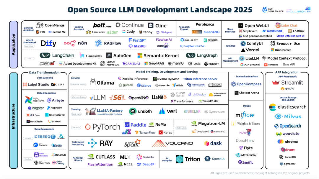 位于生态全景图下方的基础设施层,涵盖了数据转换、模型训练、开发、部署以及数据治理等多个方面的项目。包括数据标注、数据整合、数据治理层面,如 Label Studio、Airflow 等;在服务与训练层,包括提供大模型服务部署的 Ollam、深度学习框架 PyTorch、TensorFlow 等;以及 Ray、Spark 等分布式处理框架;CUTLASS、FlashAttention 等硬件加速库。