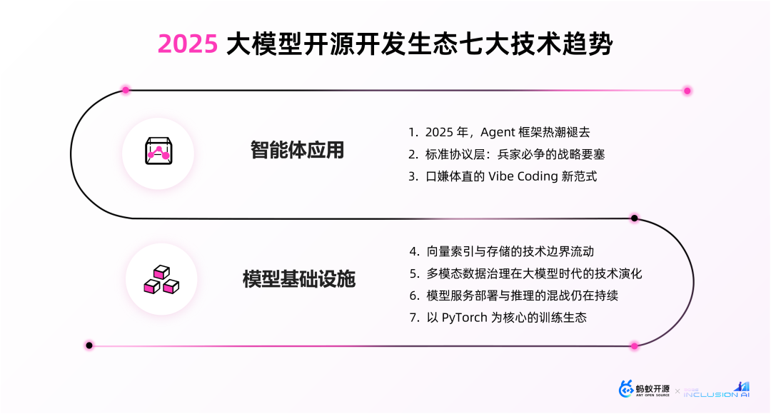也正因如此,蚂蚁开源最新发布的《2025 ⼤模型开源开发⽣态全景与趋势》报告才显得格外有意义。这份报告既涵盖了智能体应⽤层和模型基础设施层,⼀共 19 个技术领域的 135 个项⽬,又对大模型开发生态的七个趋势做了深度解读。