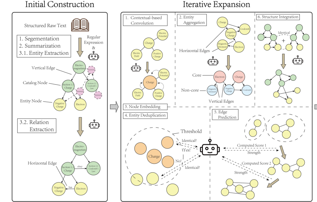 | Phase-1 显式骨架 | 教材 PDF | 目录解析 → 自底向上摘要 → 实体/关系抽取 | 树状层级图(章节-实体) |