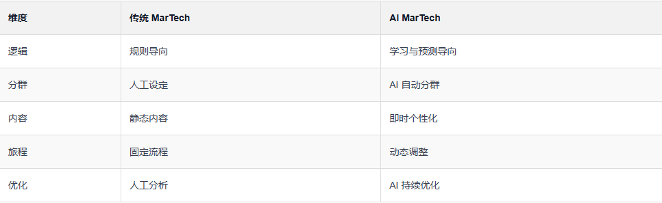 与传统 MarTech 相比,AI MarTech 的关键差异在于: