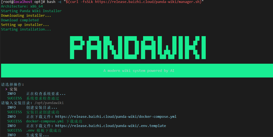 使用 root 权限登录服务器,执行以下命令安装PandaWiki。