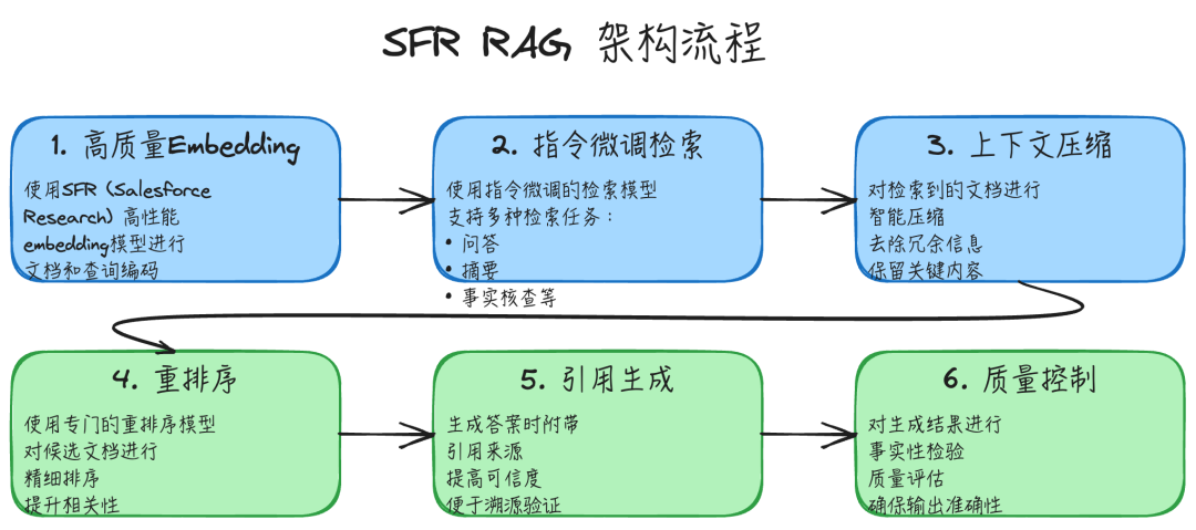 SFR RAG(Salesforce Research RAG)是工业级高质量 RAG 的最佳实践。它采用经过指令微调的高性能 embedding 模型(如 BGE),结合 Cross-Encoder 重排序、上下文压缩、引用生成和质量验证等多项优化技术。
