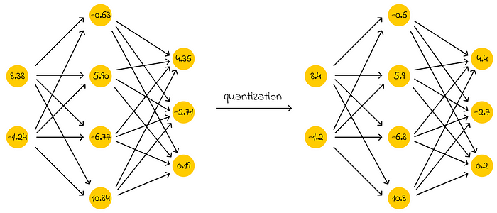常规神经网络的权重参数多采用32位浮点数(FP32)存储,每个参数占用4字节空间。量化技术的核心思路是:在不显著损失模型性能的前提下,将权重参数压缩为更低精度(如16位浮点数FP16、8位整数INT8,甚至4位整数INT4),从而减少存储和传输成本。