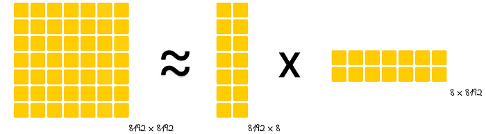 具体来说,若原始权重矩阵为n×m维度,我们可将其近似分解为n×k和k×m两个矩阵(其中k为内在维度,且k远小于n和m,即k << n, m)。