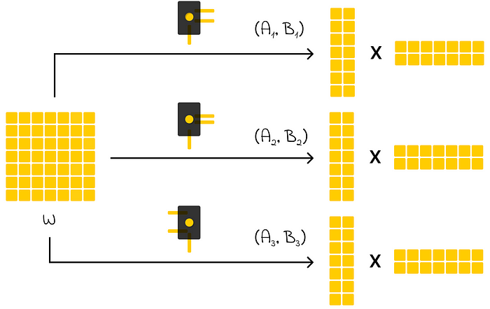 举个实际应用场景:假设我们已训练好一个基础大模型W,能实现通用自然语言理解。现在需要适配三个不同下游任务:问答系统、文本摘要、聊天机器人。此时无需分别微调三个完整大模型,只需针对每个任务训练一组LoRA适配器: