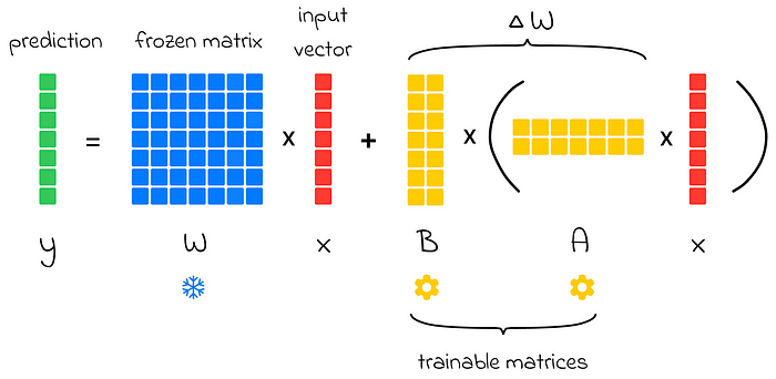 LoRA的关键创新的是用两个低秩矩阵A(n×k)和B(k×m)的乘积替代ΔW(即ΔW = BA),最终输出公式变为y = Wx + BAx。微调时,我们冻结原始权重W,仅优化低秩矩阵A和B的参数——由于A和B的维度极小,参数量远小于原始权重矩阵,训练压力会大幅降低。