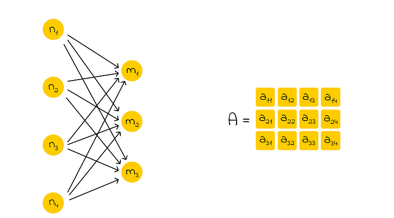 要理解LoRA的原理,首先需明确神经网络的基本构成的表征方式。以最常见的全连接神经网络为例:每一层包含n个神经元,与下一层的m个神经元形成全连接关系,这一层的所有连接可通过一个n×m维度的权重矩阵精准描述。