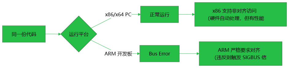 总线错误:非对齐地址 + ARM 严格检查 + 浮点指令更敏感。x86 能跑不代表 ARM 能跑,#pragma pack 要谨慎使用。