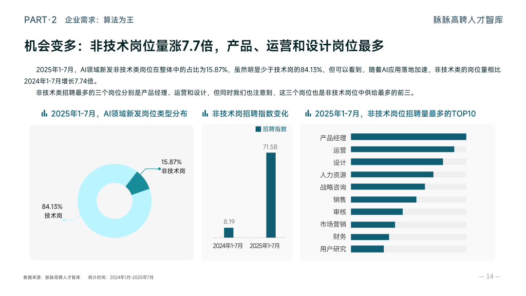 2025 年 1-7 月,AI 非技术岗量同比增 7.74 倍,占比达 15.87%;