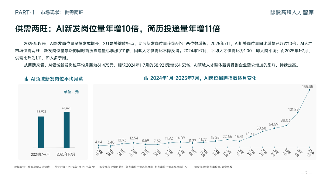 2025 年以来,AI 领域彻底 “火了”:新发岗位量同比暴涨 10 倍,仅 7 月单月增幅就超 10 倍;与此同时,简历投递量也同步增长 11 倍。但看似 “供需平衡” 的背后,人才供需比已从 2024 年的 1.00(人岗平衡)升至 1.11,意味着 “1.11 个求职者抢 1 个岗位”,部分核心岗位竞争更激烈。