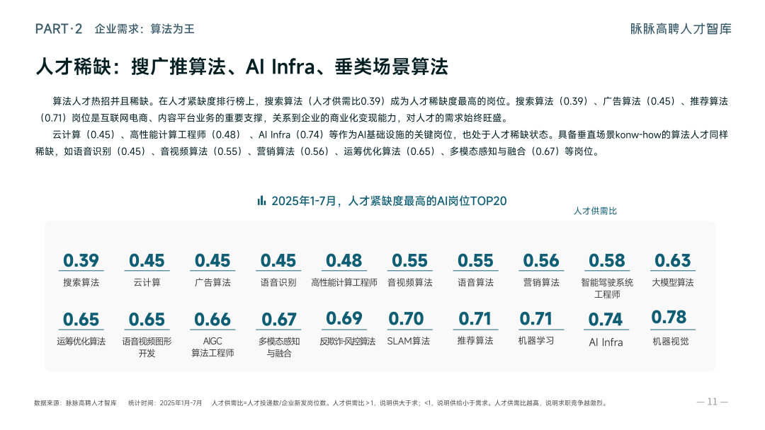 广告算法、语音识别、云计算、高性能计算工程师供需比均为 0.45,AI Infra、垂类场景算法(如营销算法、运筹优化算法)也处于 “供给紧缺” 状态。