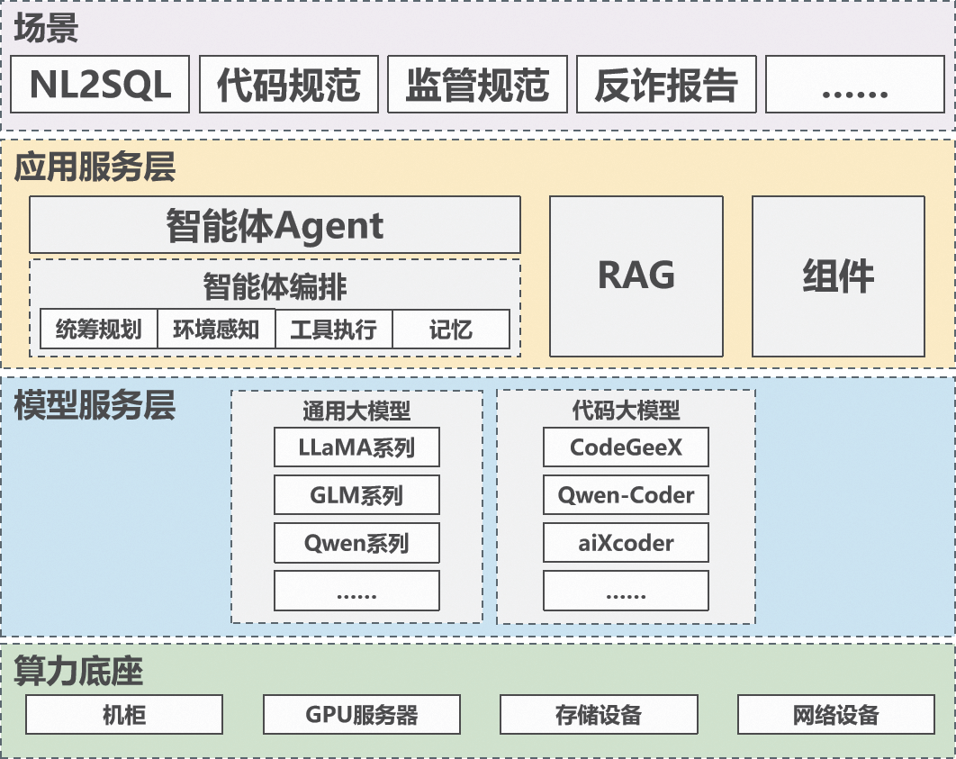北京农商银行在代码大模型建设方面,采用“算力-模型-应用-场景”的全栈式建设路径:以自主可控弹性算力资源池为底座,支撑模型的部署与运行;以多种开源大模型为核心,实现模型的快速部署与迭代,为上层应用提供灵活的模型选择;构建智能体、RAG与组件化等应用服务,为多种业务场景提供智能化支持;挖掘场景应用,推动大模型能力落地。完整呈现“技术筑基-能力沉淀-场景创新”的数字化转型方法论。
