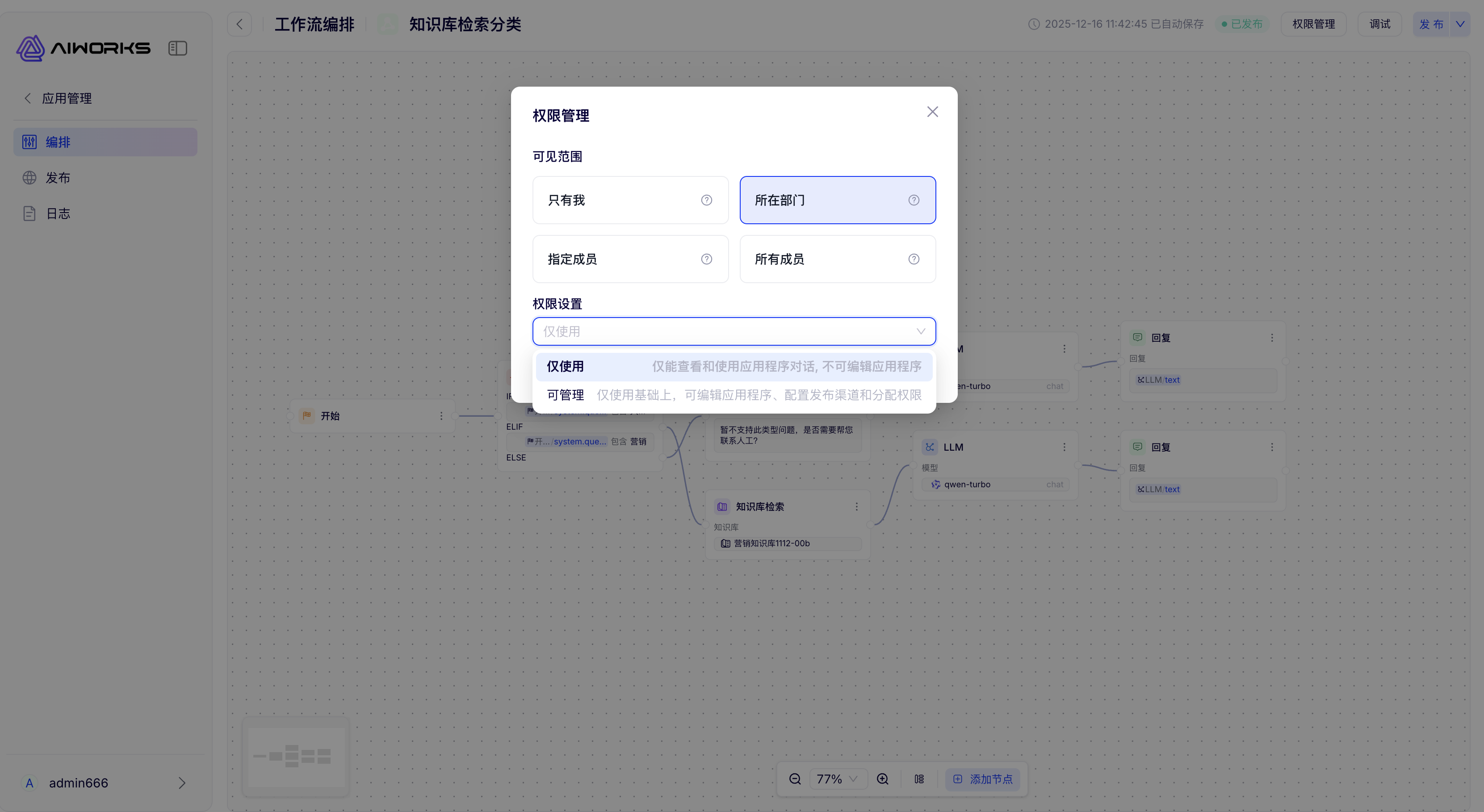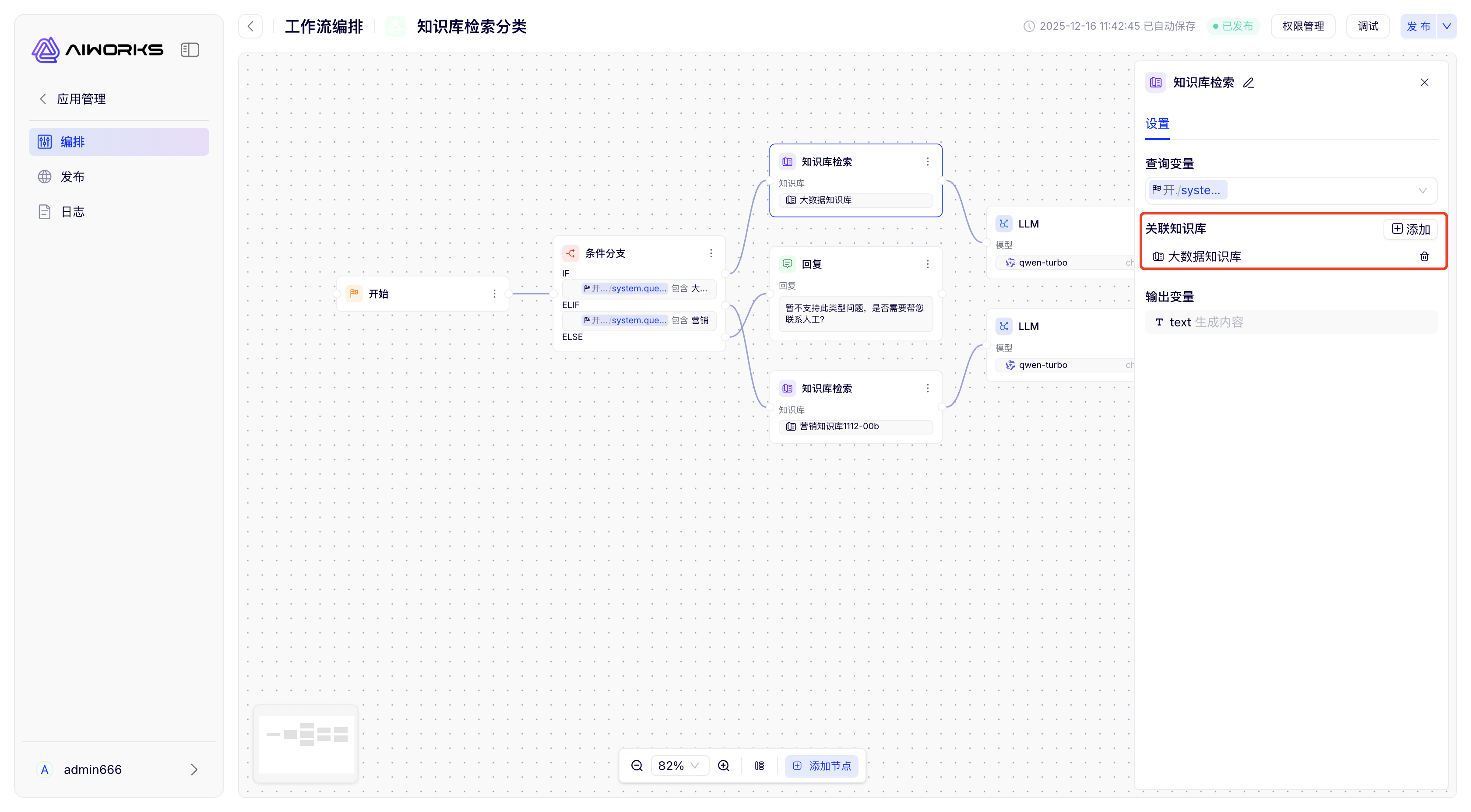 企业级 Agent 的分水岭,不在“会不会说”,在“能不能按流程把事办完”。AIWorks 的工作流编排用拖拉拽方式把 LLM、知识库、判断、代码、API、内置节点串成一条“可执行链路”,支持变量与上下文管理、条件判断、并行执行、出错重试、结构化输出等常用生产能力,真正面向“业务流程自动化”。