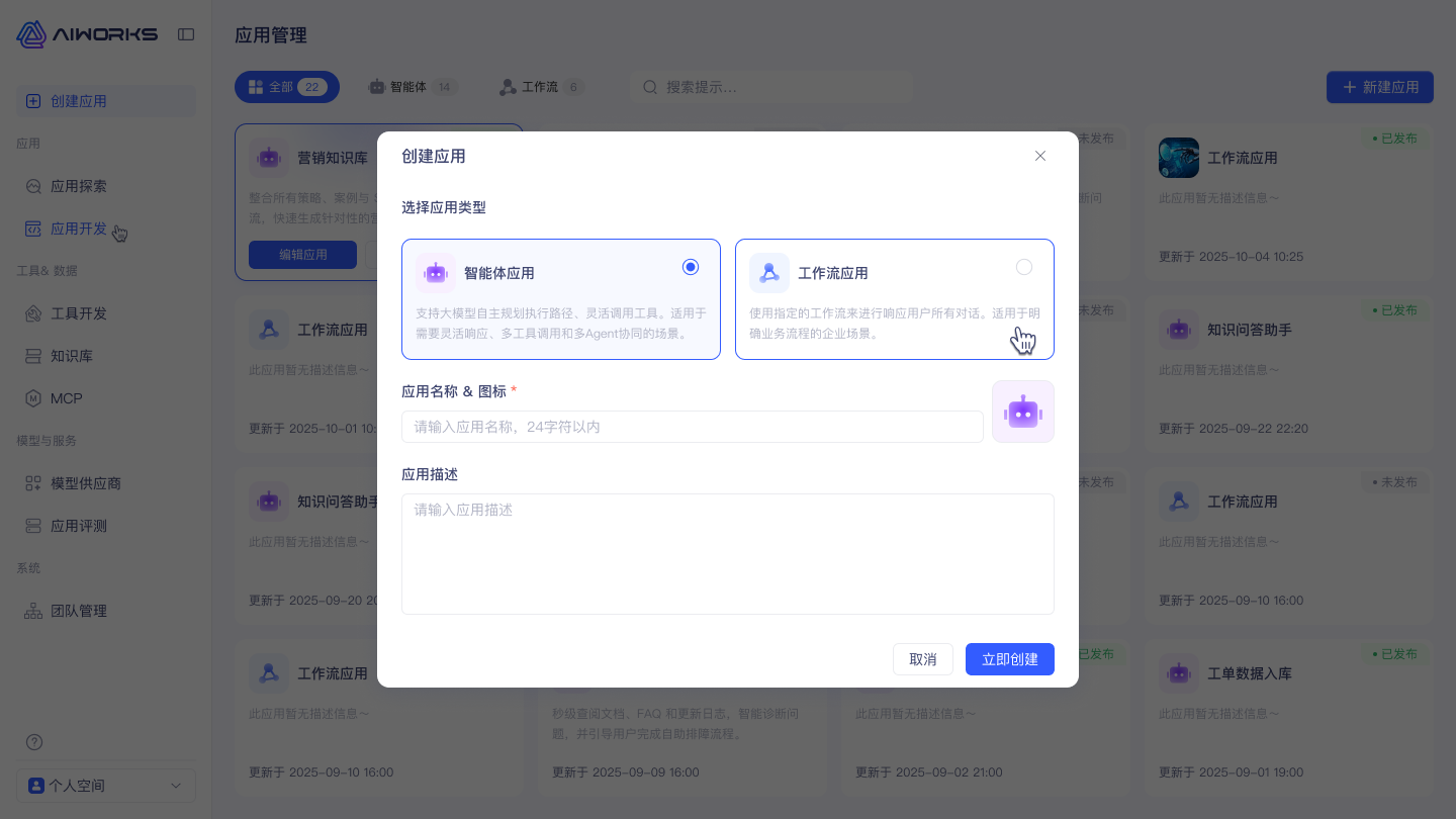 AIWorks 不只支持“搭流程”,也支持“搭智能体”。你可以选择两种典型形态: