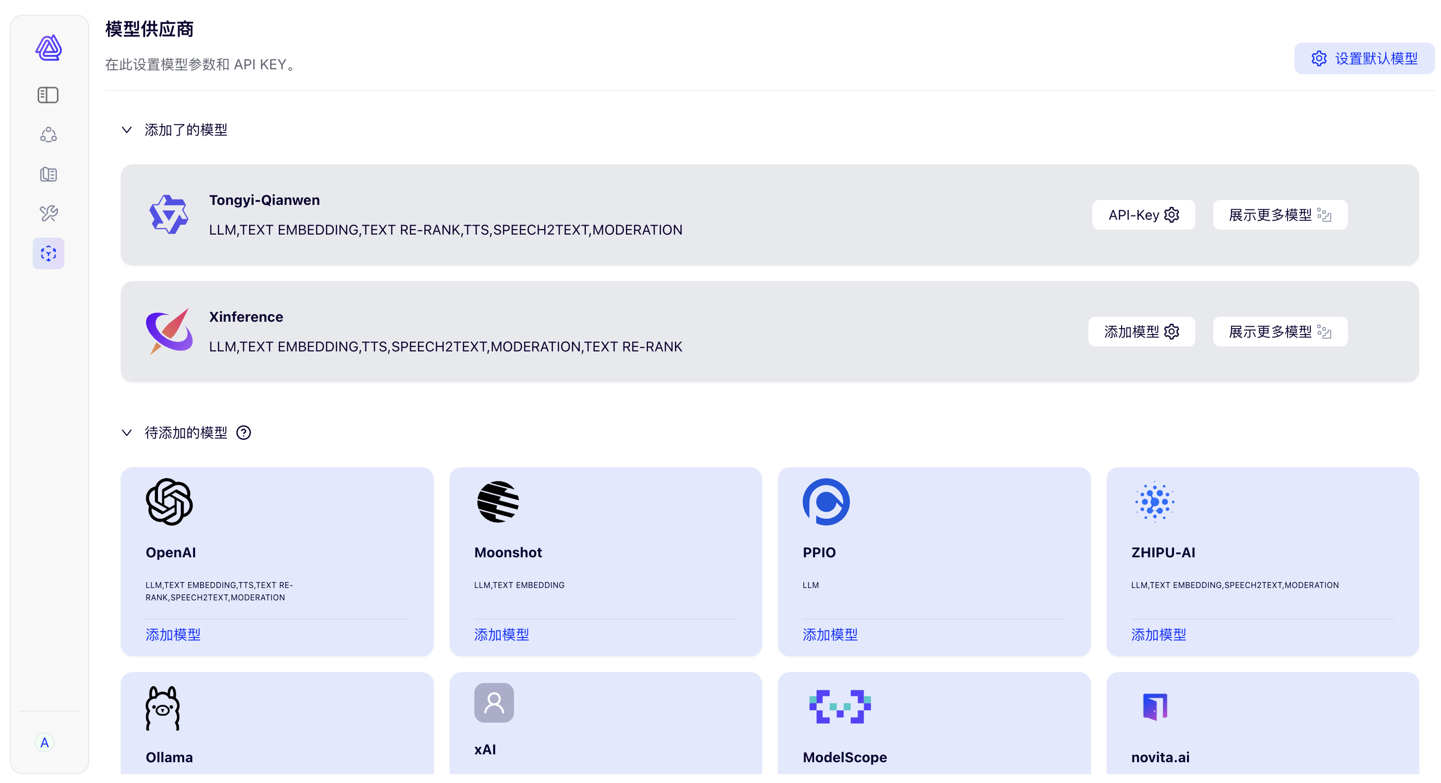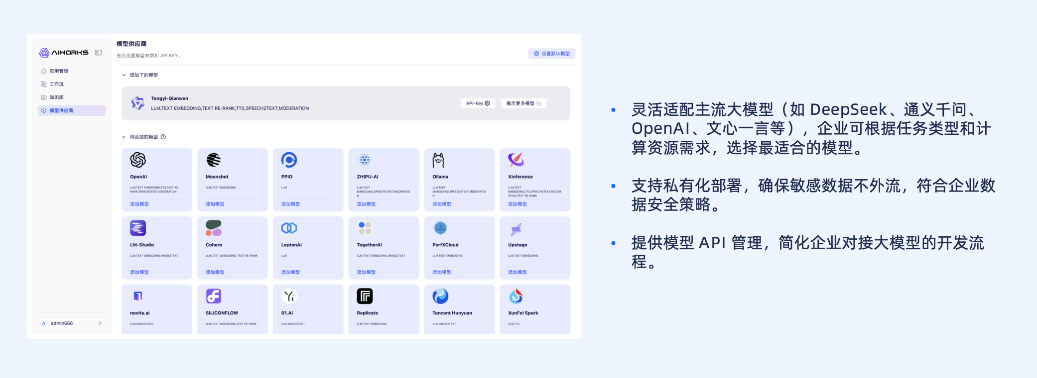企业做 Agent,第一步不是“选一个模型”,而是“把模型变成可管理的生产资源”。AIWorks 原生支持主流大模型统一接入与管理(如 DeepSeek、通义千问、OpenAI 等),并提供模型 API 管理、默认模型配置与自定义模型端点能力,让模型接入不再是项目级的重复工作,而是平台级的标准能力。