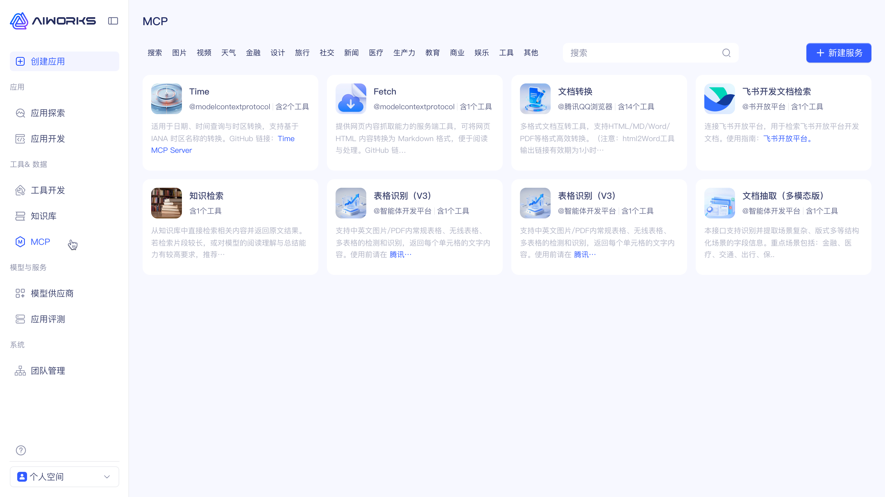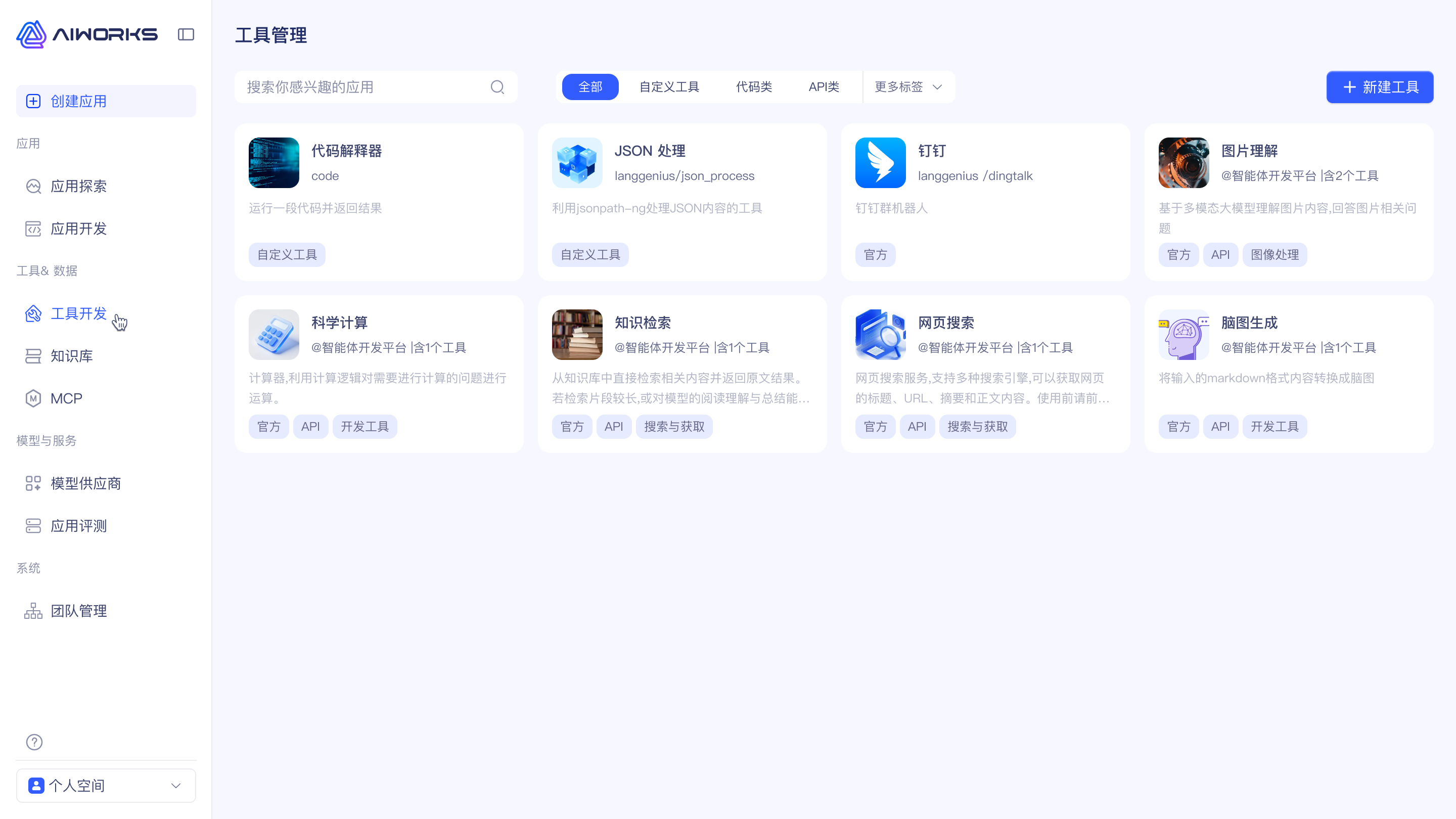 AIWorks 提供 MCP 服务与工具管理,把企业内部系统能力以标准方式注册、授权、治理,统一纳入工作流和智能体的工具库: