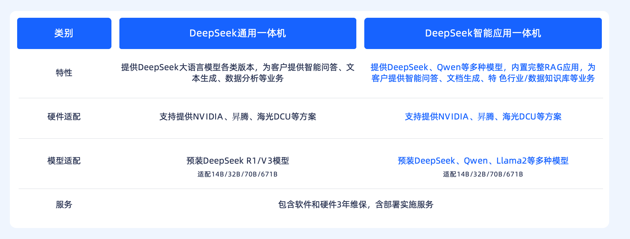 - 大模型一体机:软硬一体、开箱即用,面向高敏数据与私有化部署场景,支持主流的如DeepSeek R1-671B 满血版等配置,数据不出域、算力不外借,企业可以把它当成“可落地的模型基座”直接上生产。