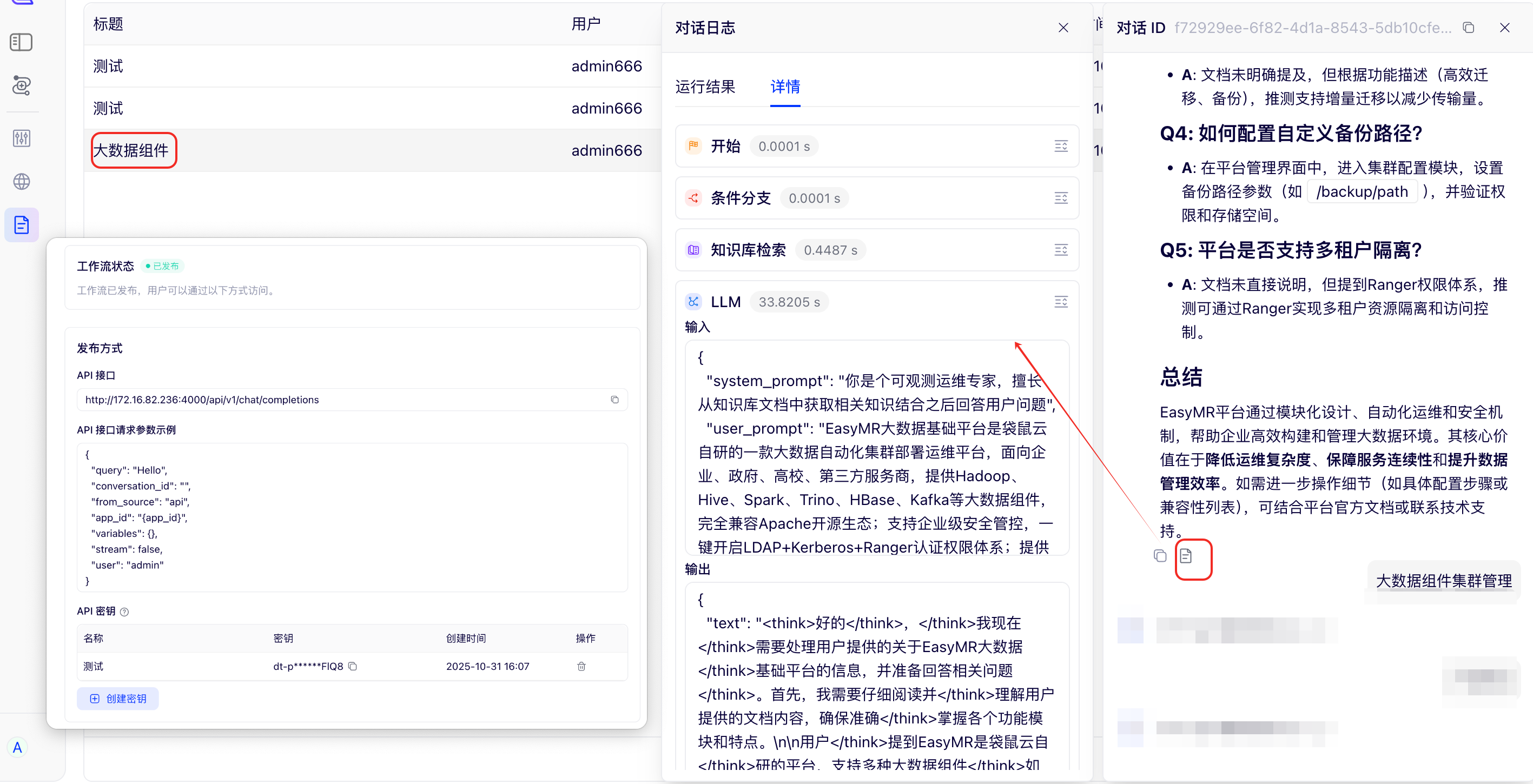 工作流应用 API 能力支持以接口形式安全、便捷地对外发布。通过新增的密钥(Key)创建与管理机制确保了外部集成调用的安全性和权限可控性。同时,平台大幅增强了调用日志的追踪能力,可深度追溯工作流每轮会话数据流转全过程,简化了线上调用故障的排查和定位,提升了工作流平台的开放性、安全性。