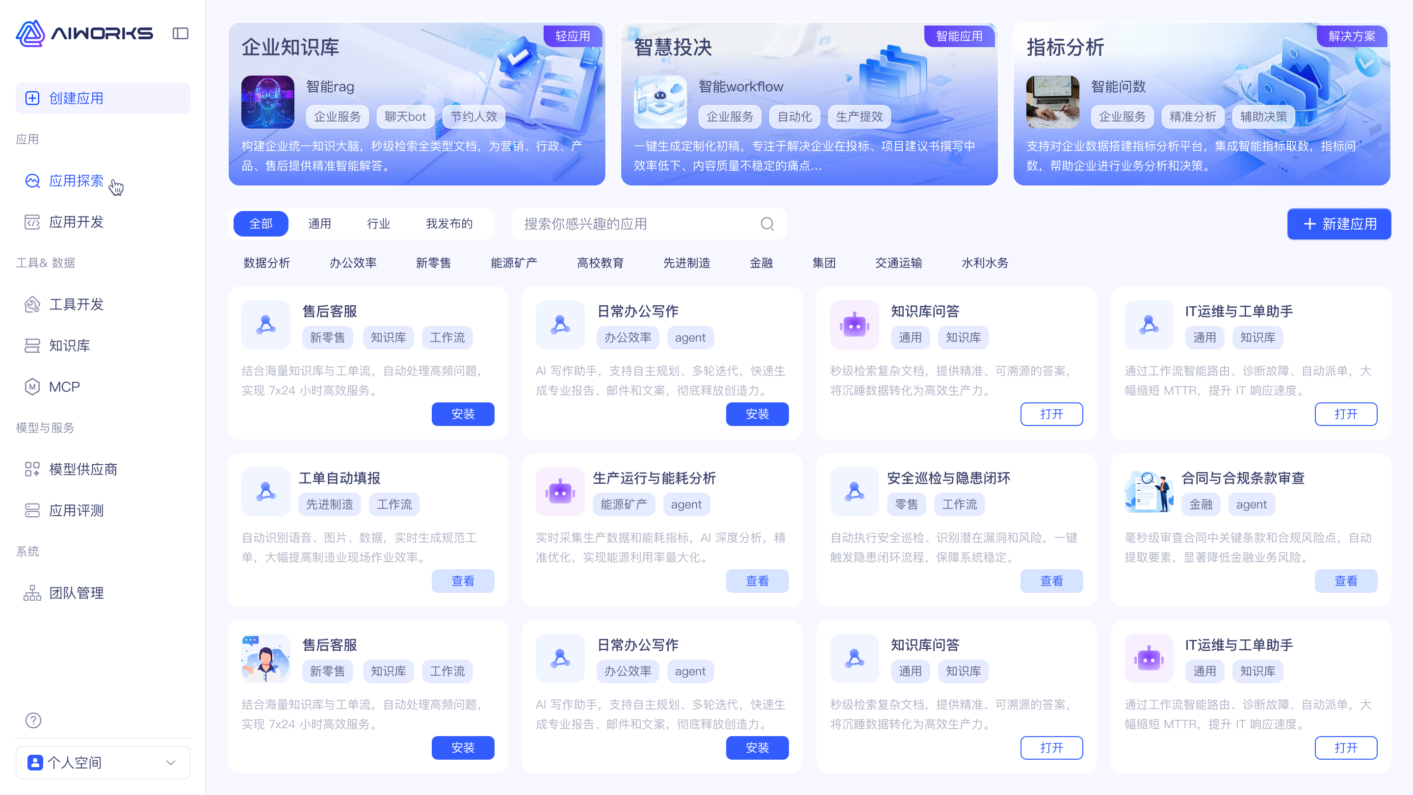 如果你不想从零搭,AIWorks 提供开箱即用的“应用市场”,覆盖通用型 Agent(知识问答、智能客服、智能报告、ChatBI 等)与行业型 Agent(能源矿产、交通运输、新零售、高校教育、先进制造、金融等)。