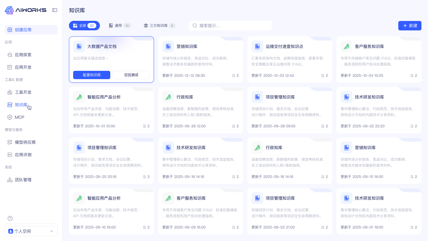 企业做 Agent,最怕“幻觉”。解决幻觉的关键不是喊口号,而是把企业知识变成可检索、可更新、可验证的资产。AIWorks 支持多格式知识库导入(PDF、Markdown、数据库等),自动解析与知识检索,让 AI 在海量文档中找到精准答案,并结合业务语义做理解优化。