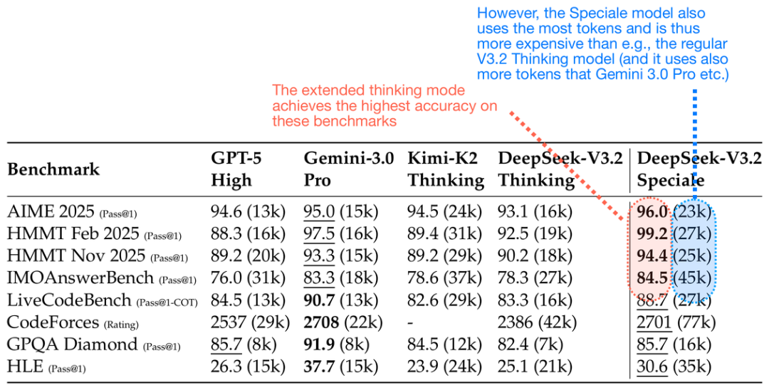 图 1:DeepSeek V3.2 与专有旗舰模型之间的基准测试对比。来自 DeepSeek V3.2 报告 并加上了注释。