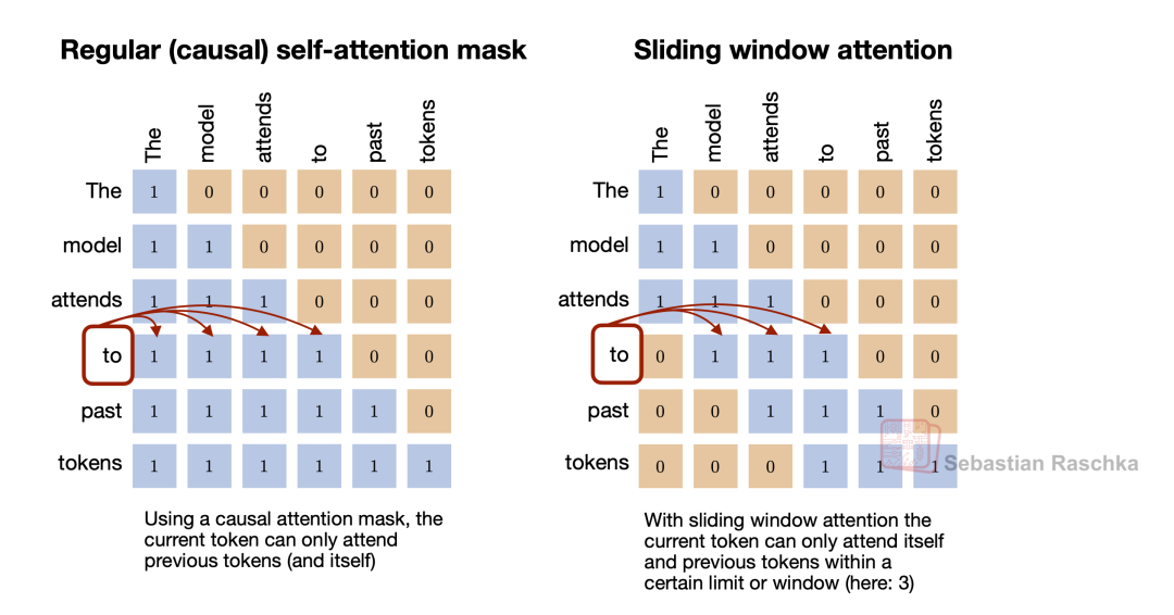 为了解释它是如何工作的,让我们从滑动窗口注意力开始。例如,滑动窗口注意力这种技术(最近被 Gemma 3 和 Olmo 3 使用)会将注意力窗口限制为固定大小,如下图所示。