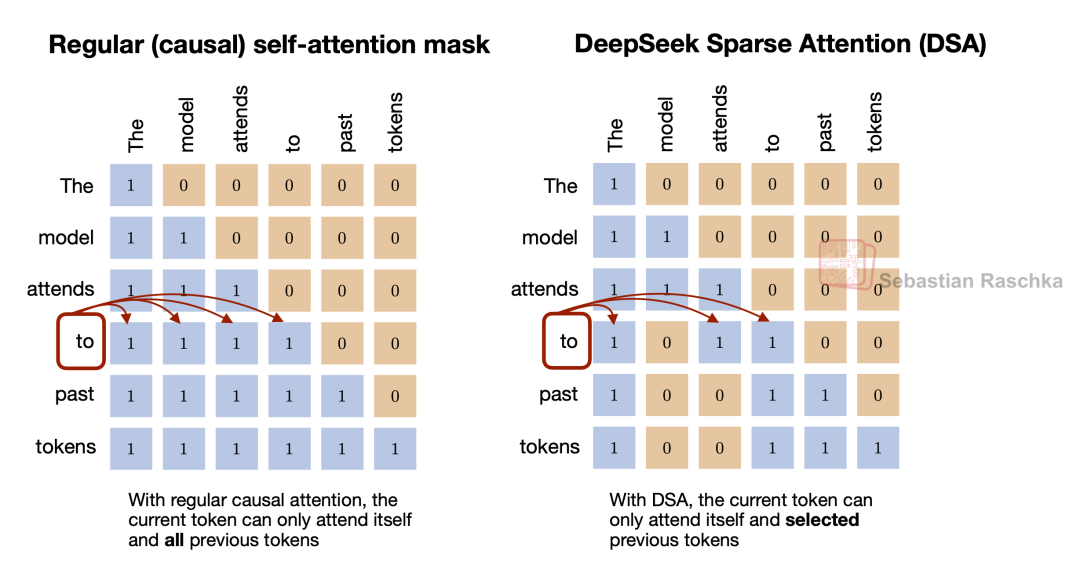 图 10:在 DSA 中,当前 Token 可以关注一组选定的过去 Token,而不是像常规因果注意力那样关注所有过去 Token。