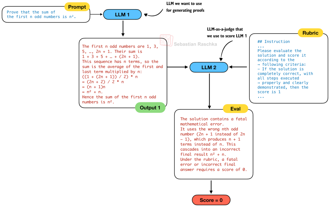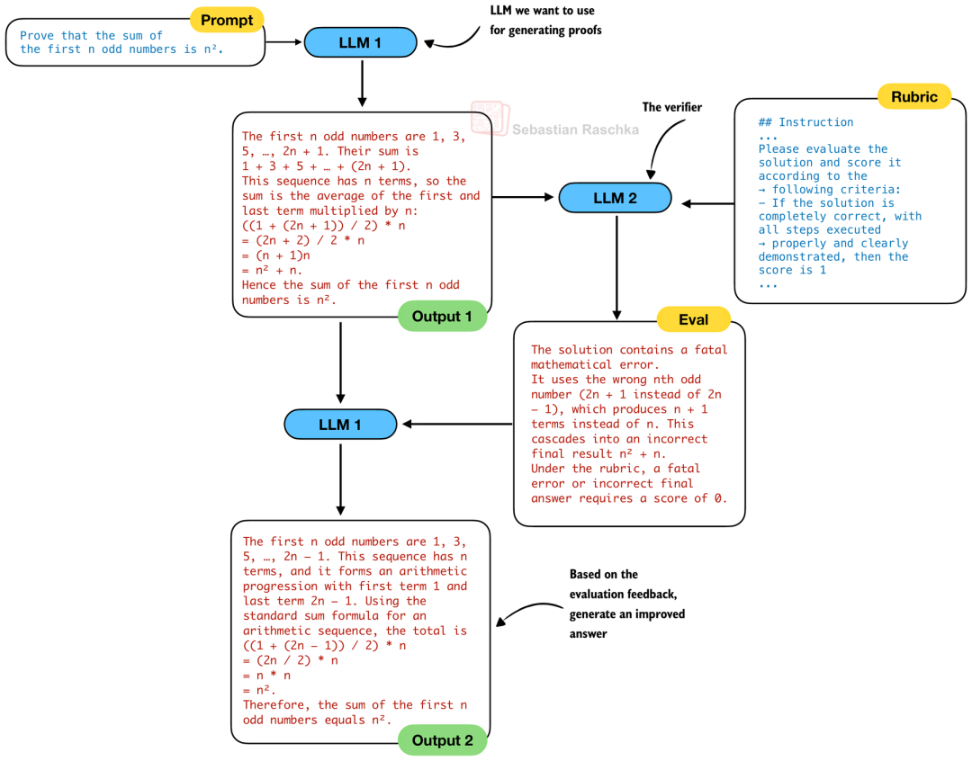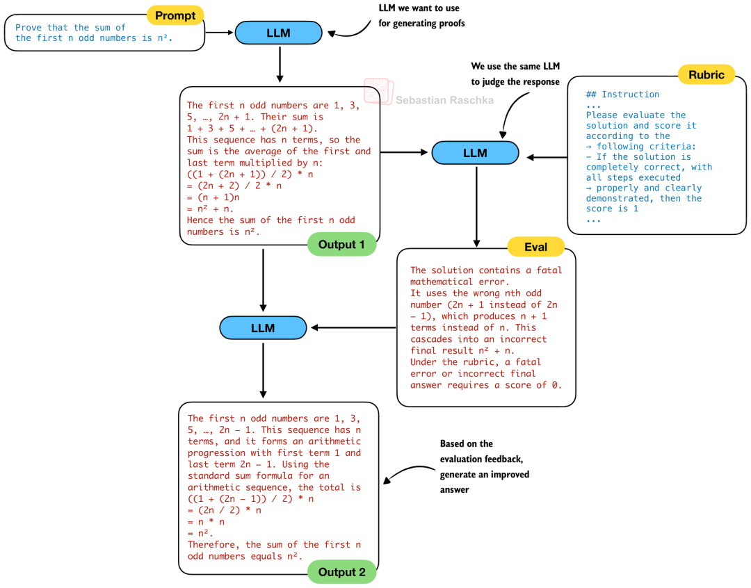 图 14:一个经典的自我修正迭代,同一个 LLM 生成初始响应(Output 1),对其进行评估(Eval),并生成修正后的答案(Output 2)。