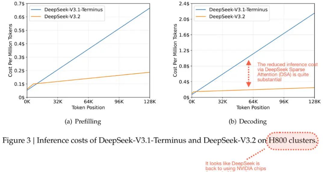 图 19:由 DeepSeek 稀疏注意力 (DSA) 实现的推理成本节省。来自 DeepSeek V3.2 报告,并加上了带注释。