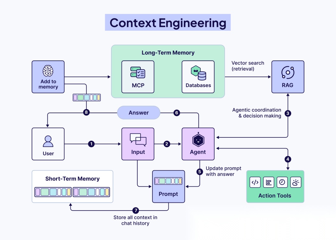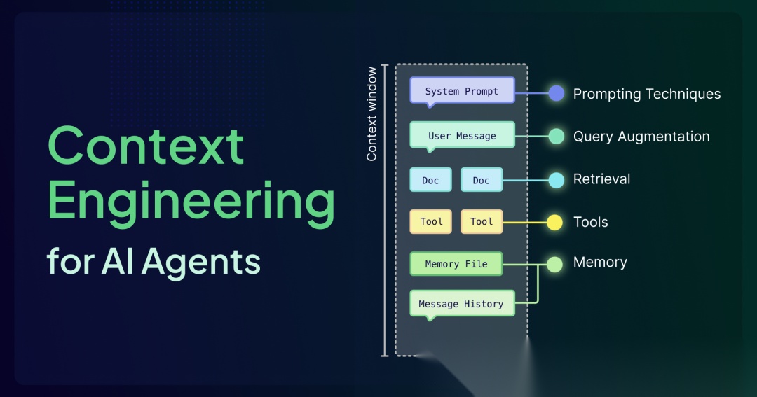 上下文工程(Context Engineering) 则是一门设计架构的学科,旨在正确的时间向 LLM 提供正确的信息。它是关于建立桥梁,将断连的模型与外部世界连接起来,检索外部数据,使用工具,并赋予它记忆,使其回答基于事实,而不仅仅是基于训练数据。