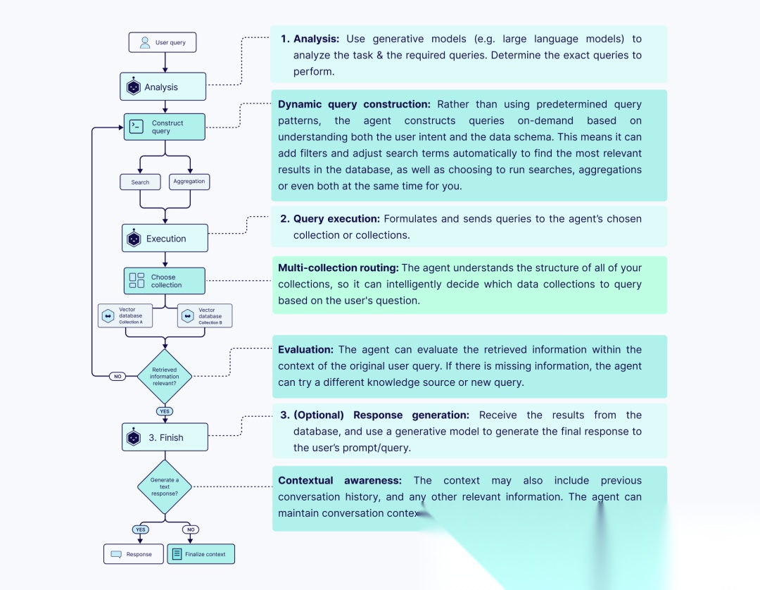 智能体可以有许多不同的任务和功能,从定义不同的检索或查询策略,到验证响应的质量或完整性,再到从可用选项中动态选择工具。智能体提供了系统所有不同部分之间的编排,以便对信息管理做出动态的、适合上下文的决策。