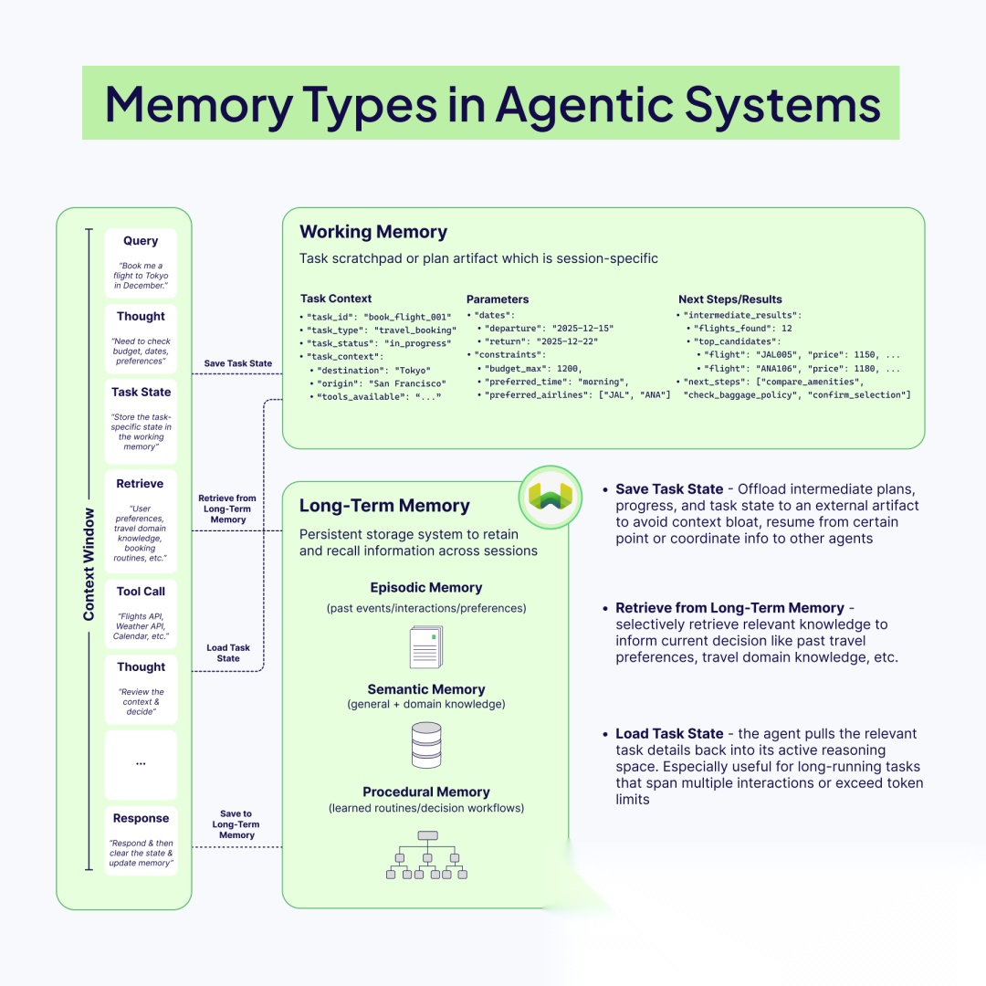 - 短期记忆(Short‑term memory): 是实时的上下文窗口:最近的对话轮次/推理、工具输出以及模型推理当前步骤所需的检索文档。这个空间极其有限,所以它应该保持精简,只保留足以维持对话连贯和决策有据可依的对话历史。