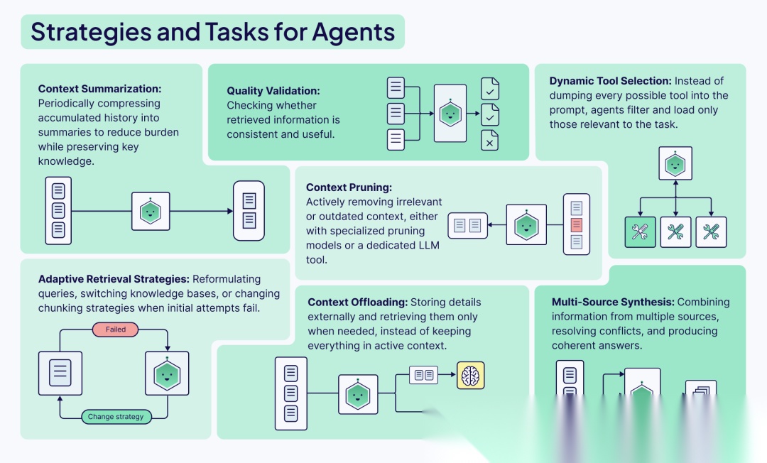 智能体位于上下文工程系统的中心。它们既是上下文的使用者(从检索到的数据、历史记录和外部知识中提取信息),也是上下文的架构师(决定呈现、保留或丢弃哪些信息)。