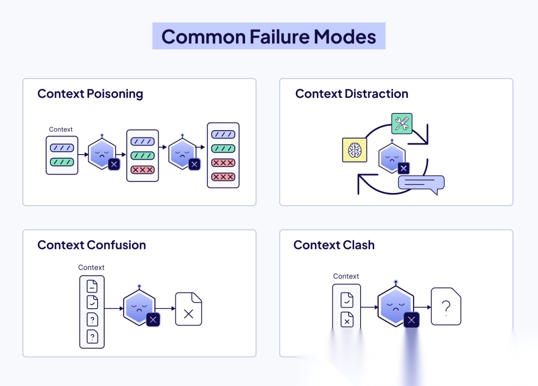 - 上下文干扰(Context Distraction): 智能体被过多的过往信息(历史记录、工具输出、摘要)所累,过度依赖重复过去的行为,而不是进行新的推理。